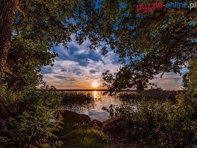 Drzewa, Trawa, Zachód słońca, Kamienie, Jezioro, Brzeg, Rośliny