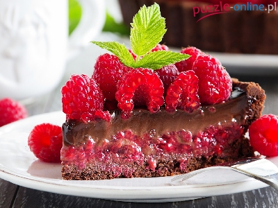 Kawałek, Listki mięty, Ciasto, Czekoladowe, Maliny