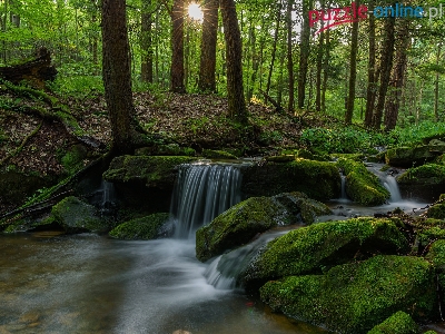 Kamienie, Promienie słońca, Las, Omszałe, Rzeka