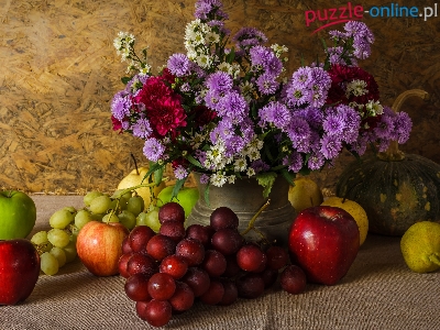Kwiaty, Bukiet, Jabłka, Gruszki, Dynia, Owoce, Wazon, Astry marcinki, Winogrona