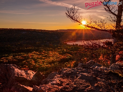 Puzzle Jezioro, Zachód słońca, Skały, Drzewa