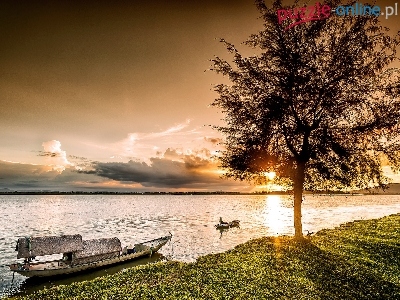 Drzewo, Jezioro, Słońca, Azja, Łódki, Wschód