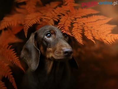 Mordka, Paproć, Pies, Jamnik krótkowłosy, Liście