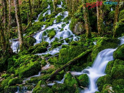 Drzewa, Omszałe, Pnie, Woda, Las, Wodospad, Kamienie