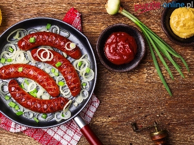 Cebulka, Patelnia, Szczypiorek, Oliwa, Deski, Keczup, Kiełbasa pieczona, Musztarda, Ścierka