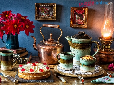 Kwiaty, Wazon, Torcik, Czajnik, Obrazki, Kubki, Kompozycja, Dzbanek, Lampa naftowa