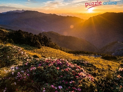 Różaneczniki, Góry, Promienie słońca, Zachód słońca, Kwiaty, Dolina