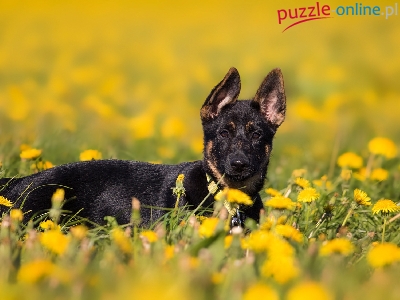 Mniszek pospolity, Owczarek niemiecki, Tło, Szczeniak, Łąka, Rozmyte