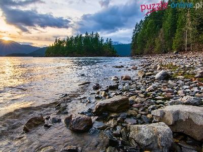 Kolumbia Brytyjska, Jezioro Harrison Lake, Promienie słońca, Kamienie, Park prowincjonalny Sasquatch, Kanada, Drzewa
