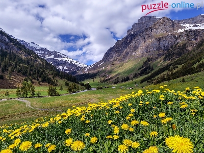 Dolina, Drzewa, Łąka, Droga, Góry, Domy, Mniszek Pospolity