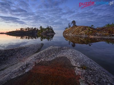 Karelia, Wysepki, Świt, Jezioro Ładoga, Drzewa, Rosja