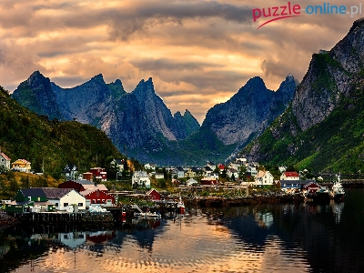 Domy, Lofoty, Chmury, Norwegia, Wieś Reine, Góry