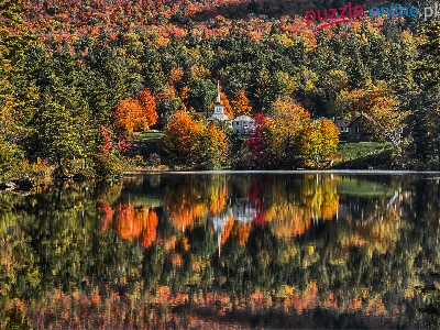 Drzewa, Jezioro, Domy, Jesień, Las, Kościół