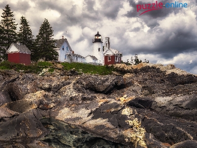 Miasto Bristol, Skały, Stany Zjednoczone, Latarnia morska Pemaquid Point Lighthouse Park, Chmury, Stan Maine