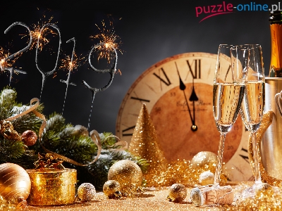 2019, Nowy Rok, Bombki, Zegar, Kieliszki, Ozdoby świąteczne, Sylwester, Prezent, Szampan
