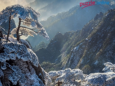 Prowincja Anhui, Mgła, Drzewa, Góry Huang Shan, Oszronione, Chiny, Zima, Sosny