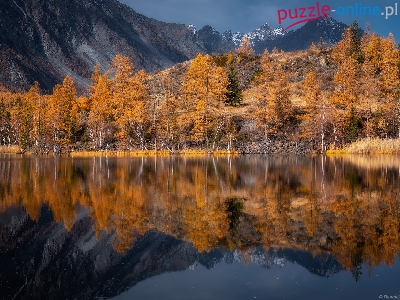 Góry, Odbicie, Rosja, Jezioro Kindyktykul, Jesień, Drzewa, Republika Ałtaju