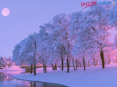 Rzeka, Księżyc, Zima, Śnieg, Drzewa