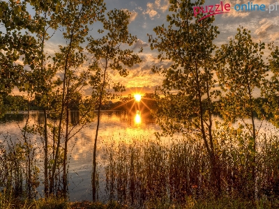 Roślinność, Promienie, Jezioro, Drzewa, Wschód słońca