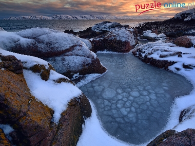 Góry, Zatoka Kolska, Obwód murmański, Morze Barentsa, Rosja, Kamienie, Skały, Miejscowość Teriberka, Zima, Śnieg