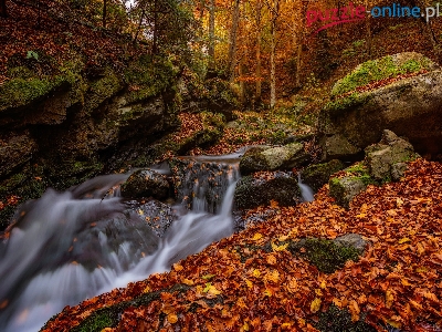 Drzewa, Rzeka, Jesień, Kamienie, Las, Skały, Liście