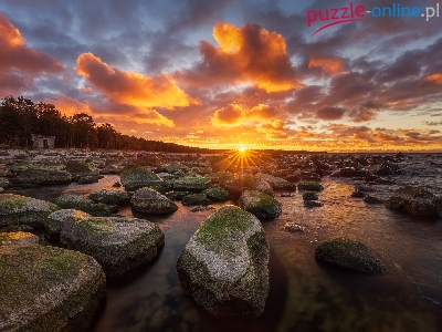 Puzzle Kamienie, Zachód słońca, Morze, Promienie słońca