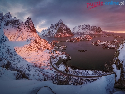 Lofoty, Droga, Domy, Wyspa Moskenesoya, Morze Norweskie Zima,  Norwegia, Wieś Reine, Góry