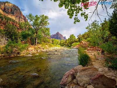Góry Watchman, Drzewa, Stany Zjednoczone, Kamienie, Park Narodowy Zion, Rzeka Virgin River, Stan Utah