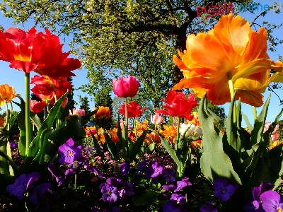 Kwitnące, Tulipany, Wiosna, Kolorowe, Bratki, Drzewo