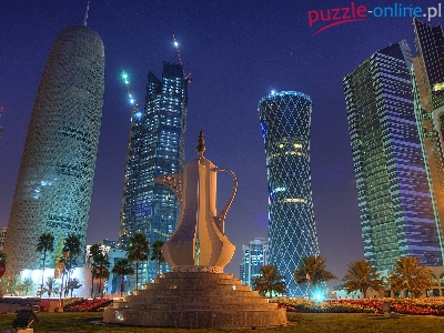 Pomnik, Doha, Noc, Katar, Drapacze Chmur, Palmy