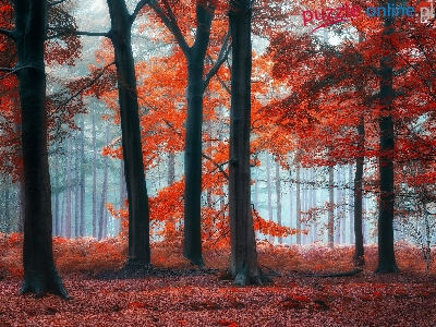 Czerwone, Mgła, Las, Drzewa, Liście