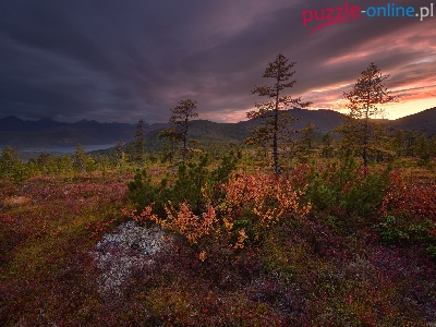 Jezioro Jack London, Drzewa, Jesień, Kołyma, Rosja, Zachód słońca, Góry, Chmury, Obwód magadański