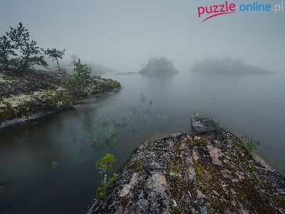 Mgła, Wysepki, Rosja, Skały, Jezioro Ładoga, Drzewka, Karelia
