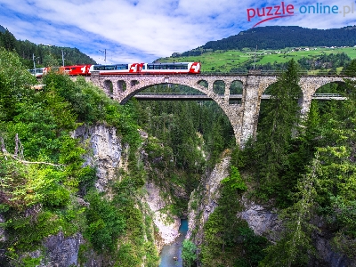 Rzeka, Skały, Wąwóz Schinschlucht, Most, Szwajcaria, Kamienny, Kanton Gryzonia, Pociąg, Łukowy, Drzewa, Solisbrucke