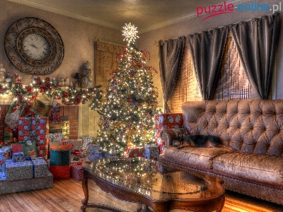 Święta, Zegar, Choinka, Choinka, Prezenty, Boże Narodzenie, Salon, Kanapa Pies