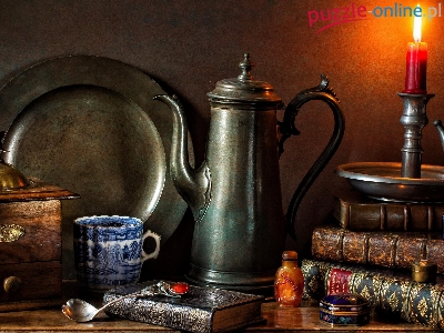 Książki, Młynek, Płomień, Dzbanek, Kubek, Świeczka