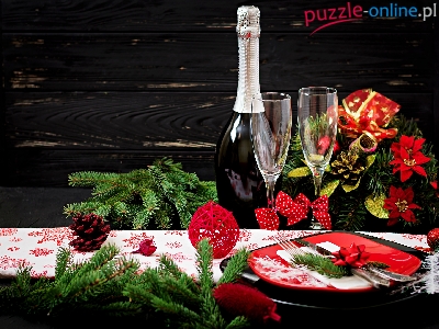 Talerze, Gałązki, Szampan, Kieliszki, Zielone