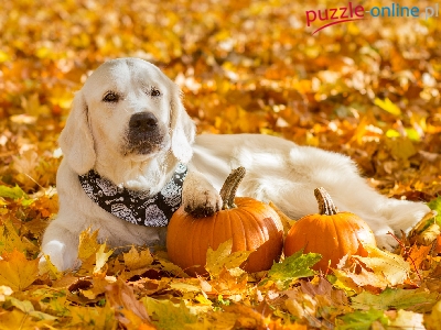 Puzzle Dynie, Pies, Golden retriever, Liście