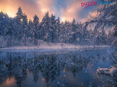 Gmina Ringerike, Drzewa, Jezioro, Śnieg, Zachód słońca, Norwegia, Zima, Las