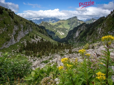 Świerki, Kwiaty, Góry, Kamienie, Rośliny