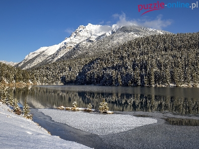 Szczyty, Góry, Zima, Jezioro, Ośnieżone, Lasy