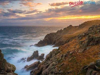 Wybrzeże, Półwysep Kornwalijski, Anglia, Zachód słońca, Morze, Kamienie, Kornwalia