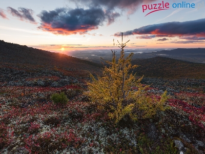Rośliny, Zachód słońca, Wzgórza, Drzewka, Chmury