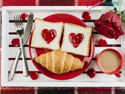 Sztućce, Kawa, Walentynki, Croissant, Śniadanie, Serce, Róża, Rogalik, Kanapki, Taca