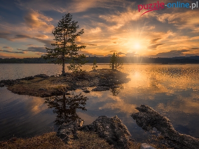 Jezioro, Gmina Ringerike, Drzewa, Norwegia, Wschód słońca, Wysepka