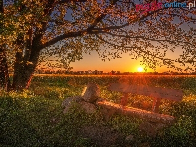 Wschód słońca, Pole, Ławka, Drzewa, Kamienie