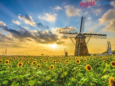 Puzzle Wiatrak, Pole, Słoneczniki, Zachód Słońca