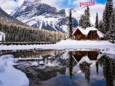 Park Narodowy Yoho, Zima, Drzewa, Góry, Most, Kanada, Jezioro Emerald, Dom