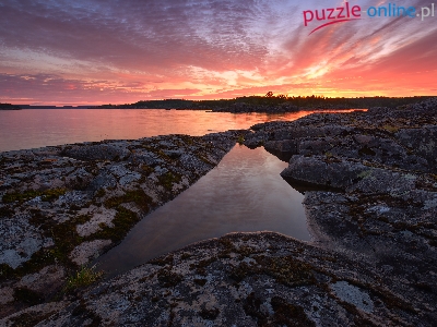 Skały, Drzewa, Rosja, Jezioro Ładoga, Zachód słońca