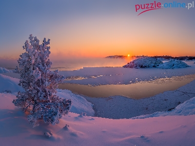 Ośnieżone, Jezioro, Zachód słońca, Zima, Mgła, Drzewo